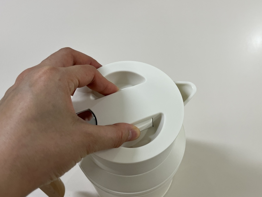 - 내용물을 따를 때는 은색 버튼을 눌러 주전자 입구를 기울이면 물이 나오도록 설계되어 있어요.